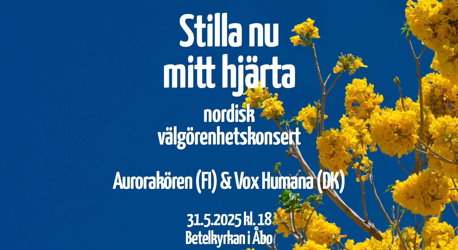 Den allra sista dagen i maj får Aurorakören besök av kören Vox Humana från Danmark. Det blir en härlig gemensam välgörenhetskonsert på temat fred och ro i Betel-kyrkan 31.5.2025 klockan 18. Den dagen firar många här i Finland att skolorna tar sommarpaus och att studenterna och studerandena vid yrkesinstitut fått sina examina. Grattis till det redan nu! Efter festligheterna kan man i år också styra kosan mot Åbo centrum och avsluta den redan fina dagen med en körmusikalisk fest. Välkomna!